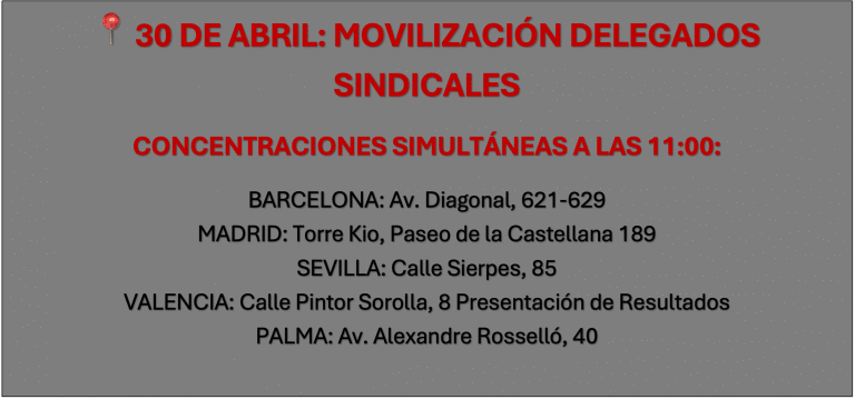 Por todo ello, hemos convocado una movilización de delegadas y delegados el próximo 30 de abril, coincidiendo con la presentación de resultados de CaixaBank, en distintas ciudades del territorio.