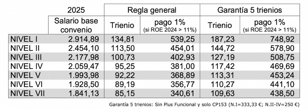 - Forma de cálculo: Coger el salario de convenio colectivo del nivel, se multiplica por 18,5, se calcula el 3% y se divide entre 12 para calcular el importe mensual del nuevo trienio.